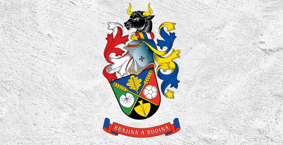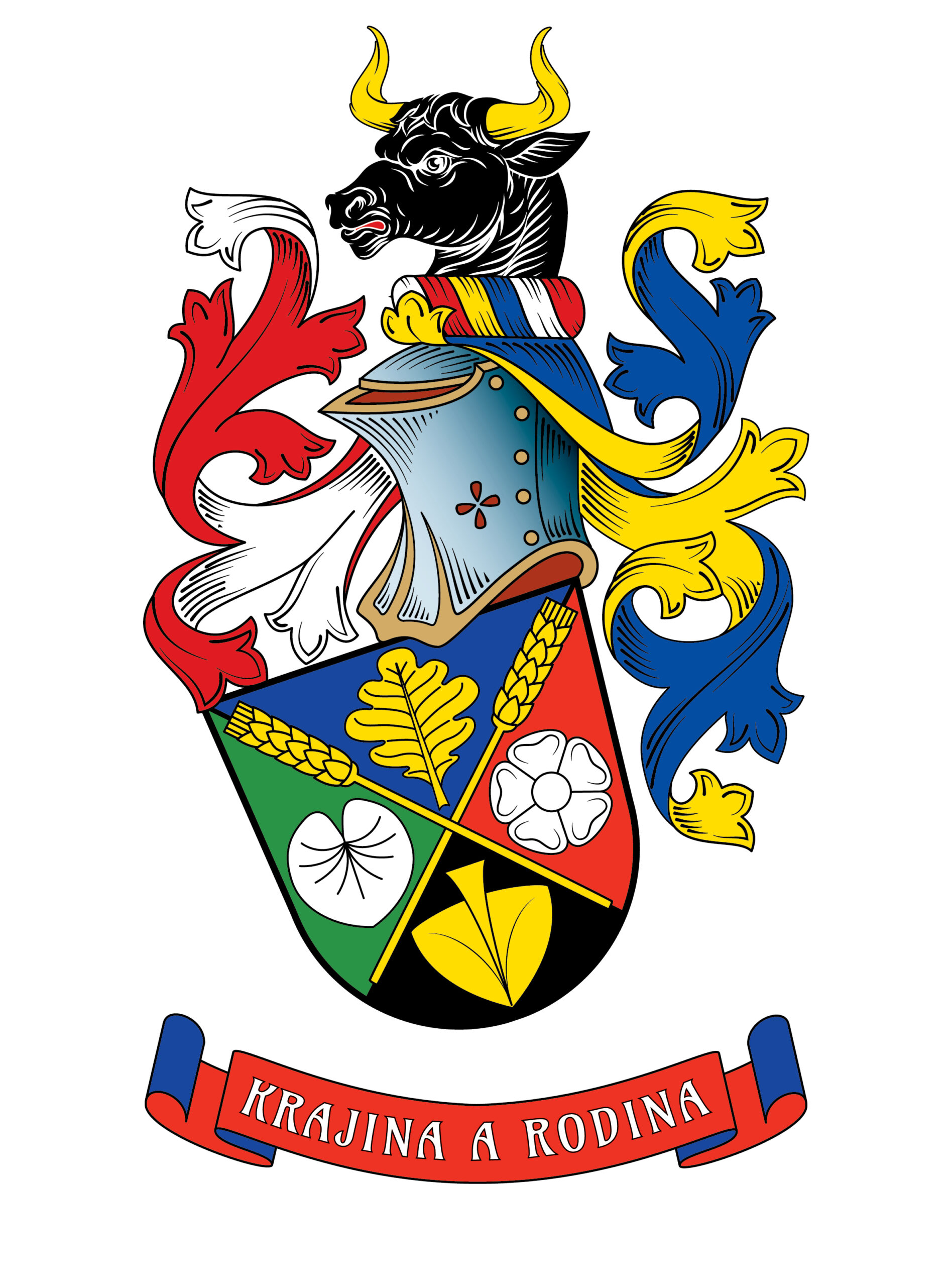 V modro-zeleno-červeno-černě kosmo čtvrceném štítě zkřížené obilné klasy, provázené nahoře vztyčeným dubovým listem a dole čelně postavenou radlicí, vše zlaté, po stranách svěšeným leknínovým listem a růží, obojí stříbrné. Na štítě kolčí přilba se stříbrno-červeno-zlato-modro-stříbrno-červenou točenicí, červeno-stříbrnými a modro-zlatými přikrývadly. Klenotem je černá býčí hlava s krkem z profilu, zlatými rohy a červenou hubou. Pod štítem červená páska s modrou podšívkou a stříbrným heslem KRAJINA A RODINA.