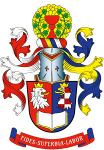 V červeno-modře polceném štítě přivrácené hlavy s krky českého lva a moravské orlice nad otevřenou stříbrnou knihou se zlatými deskami. Na štítě kolčí přilba se stříbrno-červeno-zlato-modro-stříbrno-červenou točenicí, červeno-stříbrnými a modro-zlatými přikrývadly. Klenotem je zlatý květ pampelišky s červeným kalichem mezi dvěma vyrůstajícími zelenými lipovými ratolestmi. Pod štítem červená páska s modrou podšívkou a stříbrným heslem FIDES · SUPERBIA · LABOR.
