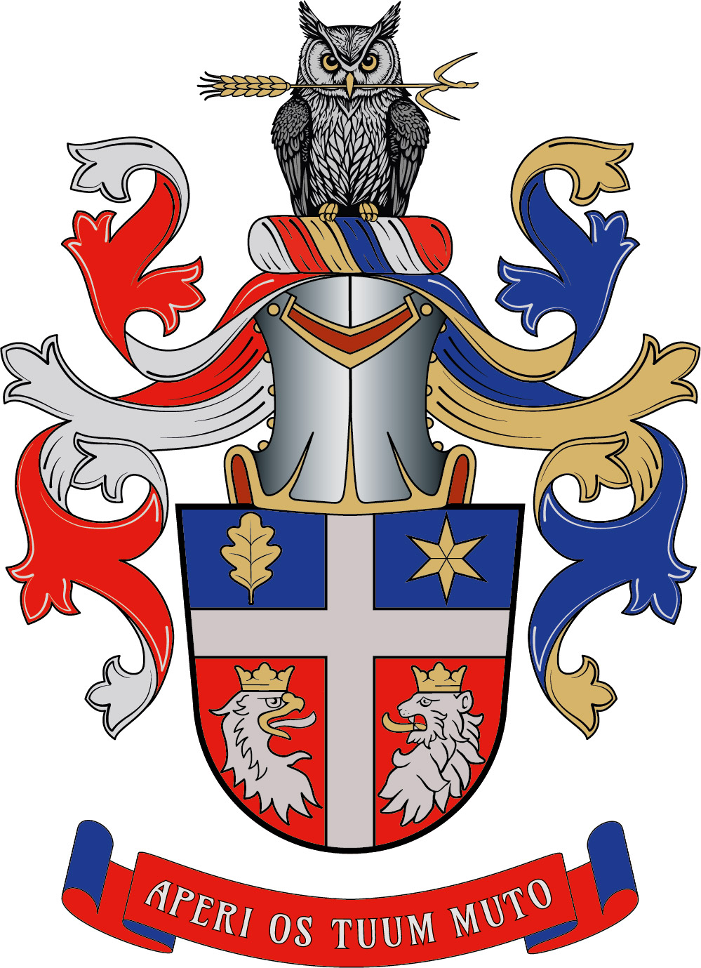 V modro-červeně děleném štítě stříbrný zvýšený heroldský kříž, provázený po stranách nahoře vztyčeným dubovým listem a hvězdou, obojí zlaté, dole přivrácenými zlatě korunovanými stříbrnými hlavami, orlí se stříbrným jazykem ve zlatém zobáku a lví se zlatým jazykem. Na štítě kolčí přilba se stříbrno-červeno-modro-zlato-stříbrno-červenou točenicí, červeno-stříbrnými a modro-zlatými přikrývadly. Klenotem je sedící sova přirozené barvy se zlatým obilným klasem v zobáku. Pod štítem červená páska s modrou podšívkou a stříbrným heslem APERI OS TUUM MUTO.