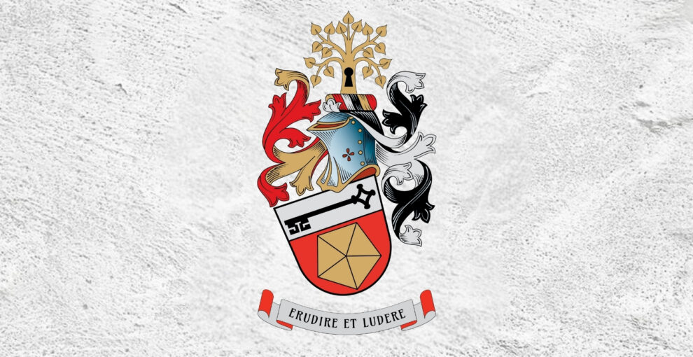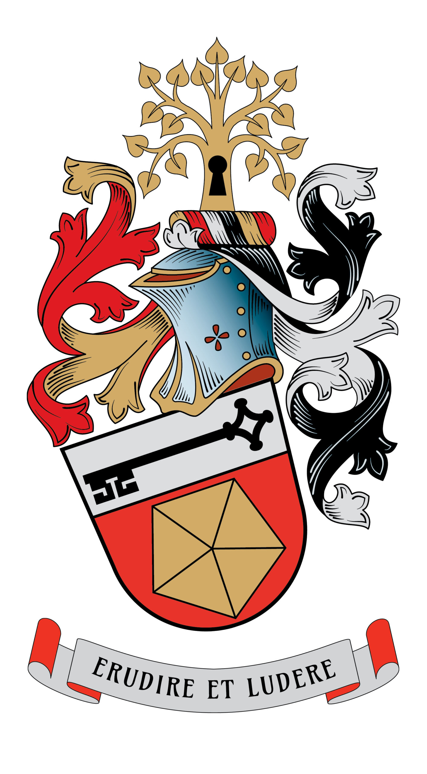 V červeném štítě pod stříbrnou hlavou s položeným černým klíčem fasetovaný zlatý pětiúhelník vrcholem dolů. Na štítě kolčí přilba se zlato-červeno-stříbrno-černo-zlato-červenou točenicí, červeno-zlatými a černo-stříbrnými přikrývadly. Klenotem je zlatá lípa s černým klíčovým otvorem v kmeni. Pod štítem stříbrná páska s červenou podšívkou a černým heslem ERUDIRE ET LUDERE.